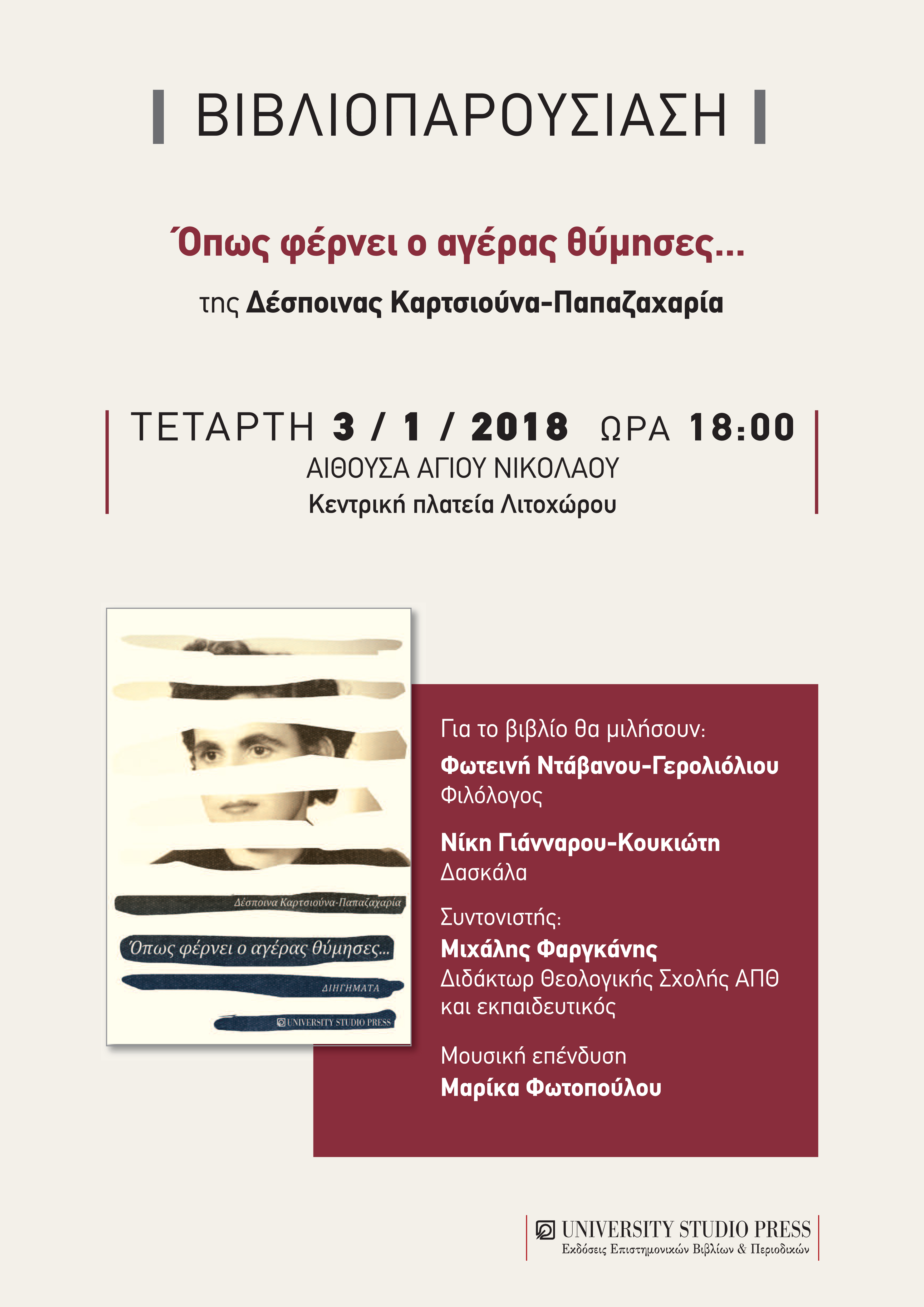 Οι Εκδόσεις University Studio Press, ο Πολιτιστικός Όμιλος Λιτοχώρου και η συγγραφέας σας προσκαλούν στην παρουσίαση του βιβλίου