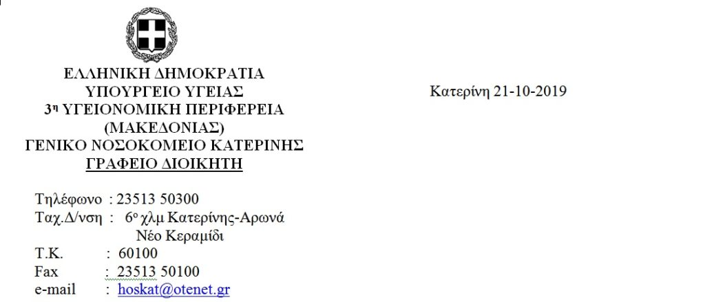 Το Γ.Ν. Κατερίνης οφείλει να ενημερώσει του πολίτες ότι προέκυψε σήμερα, Δευτέρα 21 Οκτωβρίου 2019, πρόβλημα λειτουργίας του Μαιευτικού – Γυναικολογικού τμήματος, μετά την αιφνίδια παραίτηση και των άλλων δύο Επικουρικών ιατρών του τμήματος.