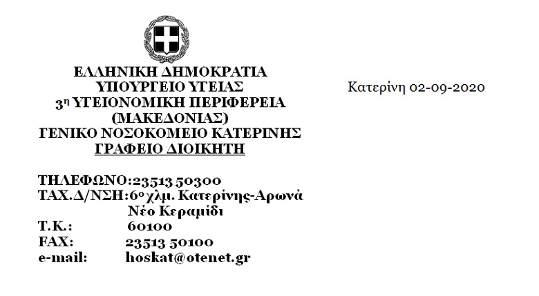 Η Διοίκηση του Γενικού Νοσοκομείου Κατερίνης ενημερώνει τους πολίτες της Π.Ε. Πιερίας για τις μέχρι σήμερα (από 01-01-2020) προσλήψεις και προκηρύξεις θέσεων ιατρικού και λοιπού προσωπικού.