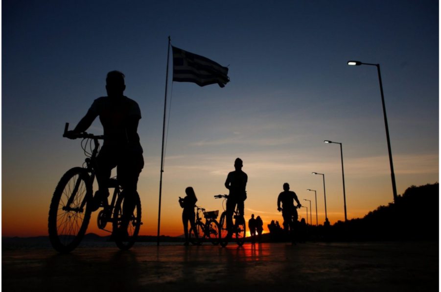 Κόσμος απολαμβάνει την βόλτα του κατά τη διάρκεια του ηλιοβασιλέματος στην παραλία του Φλοίσβου, μετά την άρση των περιορισμών μετακίνησης των πολιτών που είχαν επιβληθεί, για την καταπολέμηση της