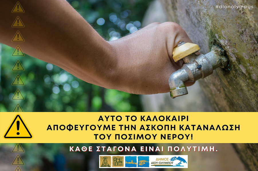 Ο Δήμος Δίου-Ολύμπου απευθύνει έκκληση προς όλους τους κατοίκους και επισκέπτες για την ορθή και κατανάλωση νερού για το επόμενο χρονικό διάστημα.