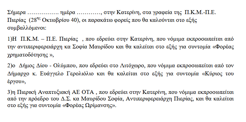 Στις πρόσφατες αποφάσεις για παράταση της σύμβασης για την μελέτη, υπάρχουν και όσα επιβάλλουν αυτές τις καθυστερήσεις, όπως οι ίδιοι οι αρμόδιοι και υπεύθυνοι τις περιγράφουν. Από την αρχή, οι συμβαλλόμενοι είναι τρεις: Αντιπεριφέρεια, Δήμος και Πιερική Αναπτυξιακή. Κι όπως όλοι γνωρίζουμε, σε μια σύσκεψη των τριών αυτών συμβαλλομένων, θα καταγράφονταν, όχι τρία, αλλά δύο πρόσωπα: ο Βαγγέλης Γερολιόλιος και η Σοφία Μαυρίδου, αφού η αντιπεριφερειάρχης εκπροσωπεί την Περιφέρεια/Αντιπεριφέρεια και την Πιερική Αναπτυξιακή, ως πρόεδρος του ΔΣ της.