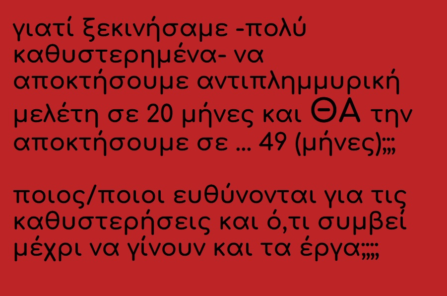 Δείτε την απόφαση με την οποία από τους 43 μήνες πήγανε στους 49 και τον πίνακα που καταγράφει τις καθυστερήσεις και τοους λόγους των καθυστερήσεων. Και δείτε και το δελτίο Τύπου για το πως όλα πάνε καλά και τα συνήθη της Σοφίας Μαυρίδου, τις ευχαριστίες …στις υπηρεσίες και καμιά κουβέντα για την μελέτη και το μέλλον, παρά μόνο ότι ο προηγύμενος σχεδιασμός είναι του 1950!!!